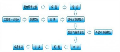 工藝主要步驟:復(fù)合鋼帶防卷--成型--彎曲--增強層纏繞復(fù)合--外層PE纏繞復(fù)合--冷卻--切割--修頭--成品堆碼。